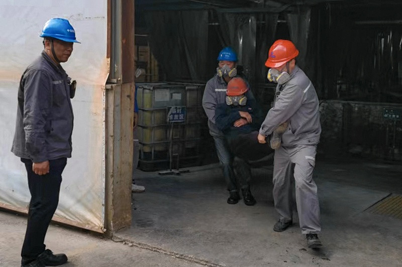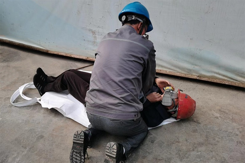 有限空間作業(yè)事故專項(xiàng)演練的地點(diǎn)為污水處理站,該演練事故情景為一名員工在污水處理池作業(yè)時(shí),不明原因站立不穩(wěn)昏迷摔倒,被發(fā)現(xiàn)后監(jiān)護(hù)人員判斷該作業(yè)區(qū)域存在有毒氣體或缺氧。搶救人員需要穿戴好呼吸防護(hù)設(shè)備,沖入現(xiàn)場(chǎng)搶救人員,將昏迷人員移至空地,使人員平躺于地面,進(jìn)行按壓急救。