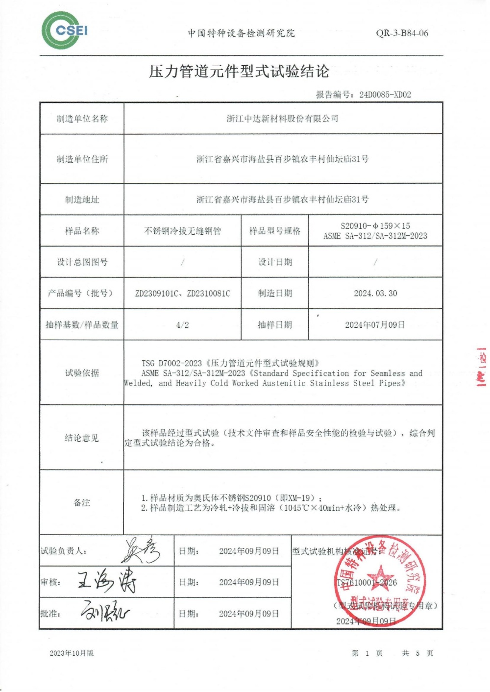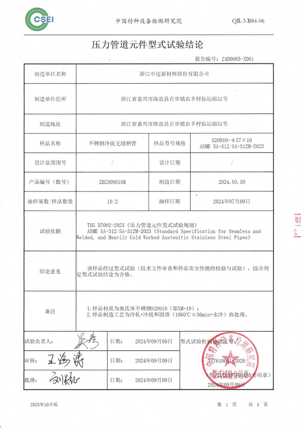 型式試驗(yàn)是在中達(dá)新材質(zhì)量檢驗(yàn)與試驗(yàn)合格的基礎(chǔ)上,由承擔(dān)型式試驗(yàn)工作的中國(guó)特種設(shè)備檢測(cè)研究院,對(duì)新材制造的XM-19無(wú)縫鋼管產(chǎn)品是否符合安全技術(shù)規(guī)范而進(jìn)行的技術(shù)資料審查、安全性能檢驗(yàn)與試驗(yàn),驗(yàn)證出廠產(chǎn)品安全可靠的活動(dòng)。通過(guò)型式實(shí)驗(yàn)所拿到的證書(shū),不單單是對(duì)新材創(chuàng)新的新產(chǎn)品認(rèn)證,更表示公司已具備生產(chǎn)此類鋼種規(guī)格的能力。