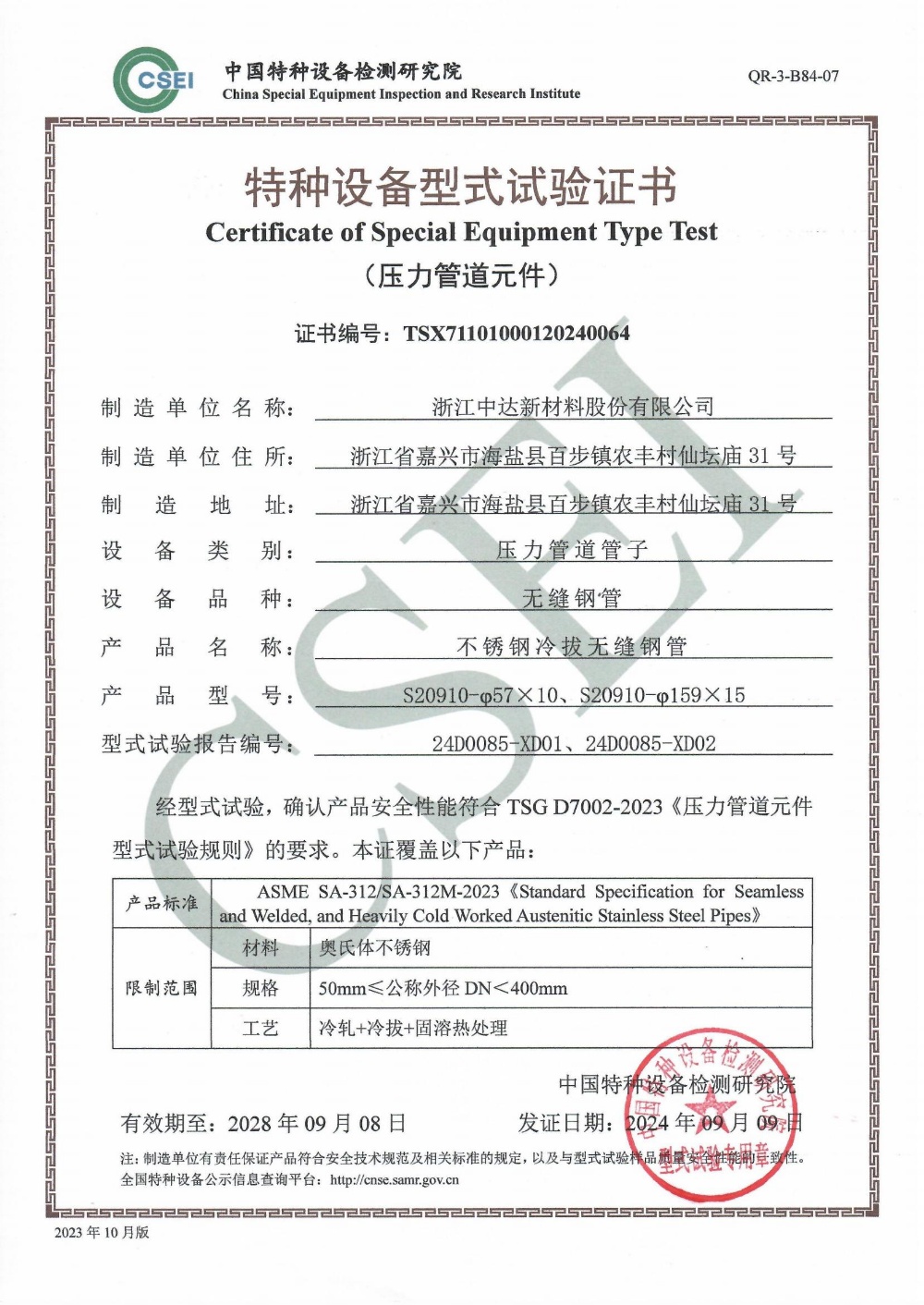 祝賀中達(dá)新材獲得壓力管道元件特種設(shè)備型式試驗(yàn)證書(shū)