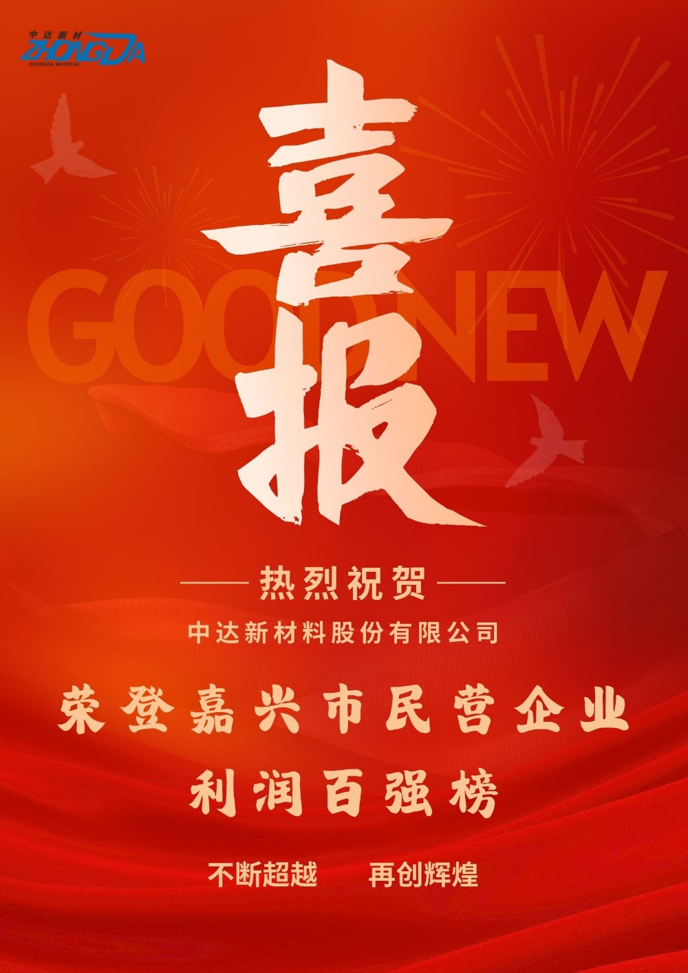 11月5日,嘉興市工商聯(lián)發(fā)布2024年嘉興市民營企業(yè)百強(qiáng)系列榜單,包括2024年嘉興市民營企業(yè)營收100強(qiáng)、利潤100強(qiáng)、研發(fā)投入100強(qiáng)、納稅100強(qiáng)、外貿(mào)出口100強(qiáng)五張榜單,中達(dá)新材成功上榜利潤100強(qiáng)!