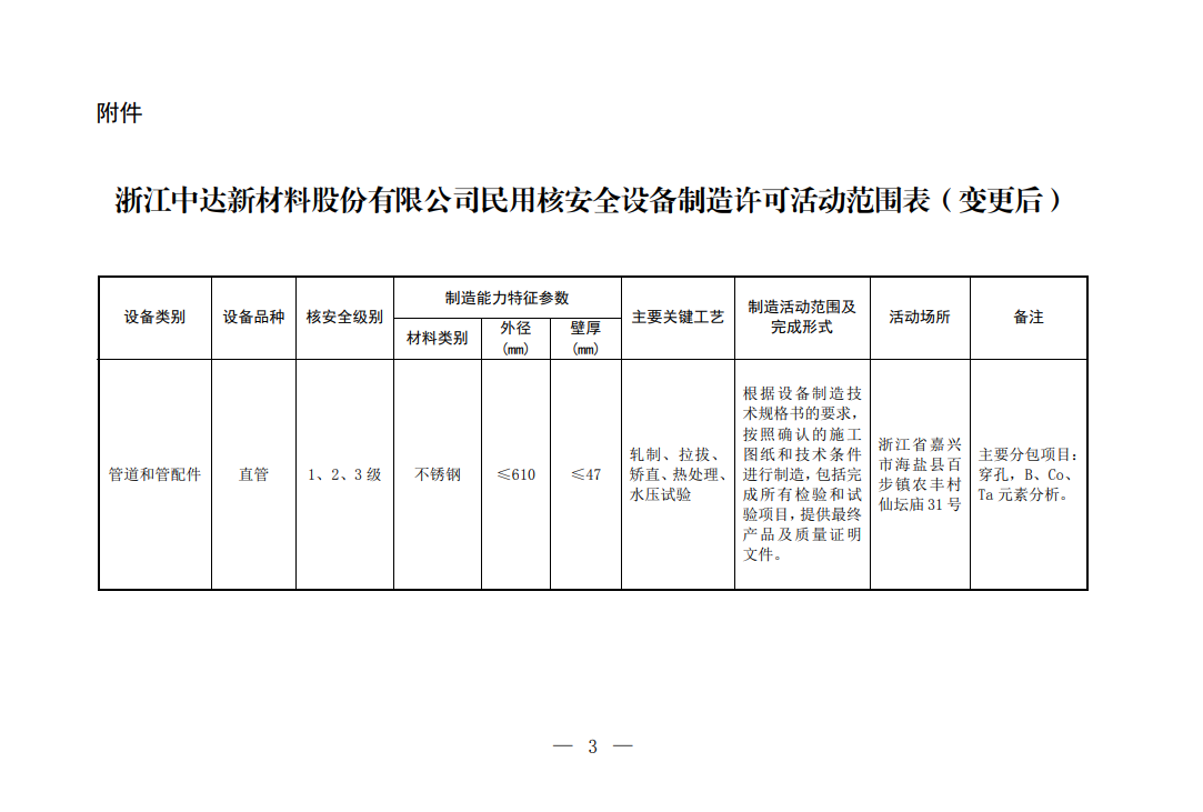 2025年4月,國家核安全局簽發(fā)了《關(guān)于批準(zhǔn)浙江中達新材料股份有限公司變更民用核安全設(shè)備制造許可活動范圍的通知》(國核安發(fā)〔2025〕59號),中達新材成功通過國家核安全局的嚴(yán)格審核,同意《民用核安全設(shè)備制造許可證》[國核安證字Z (23) 26號]變更為附件所列范圍。